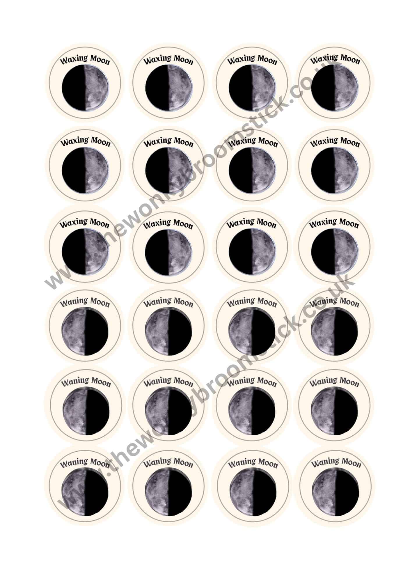 This sheet consists of 12 new moon and 12 full moon circular stickers.