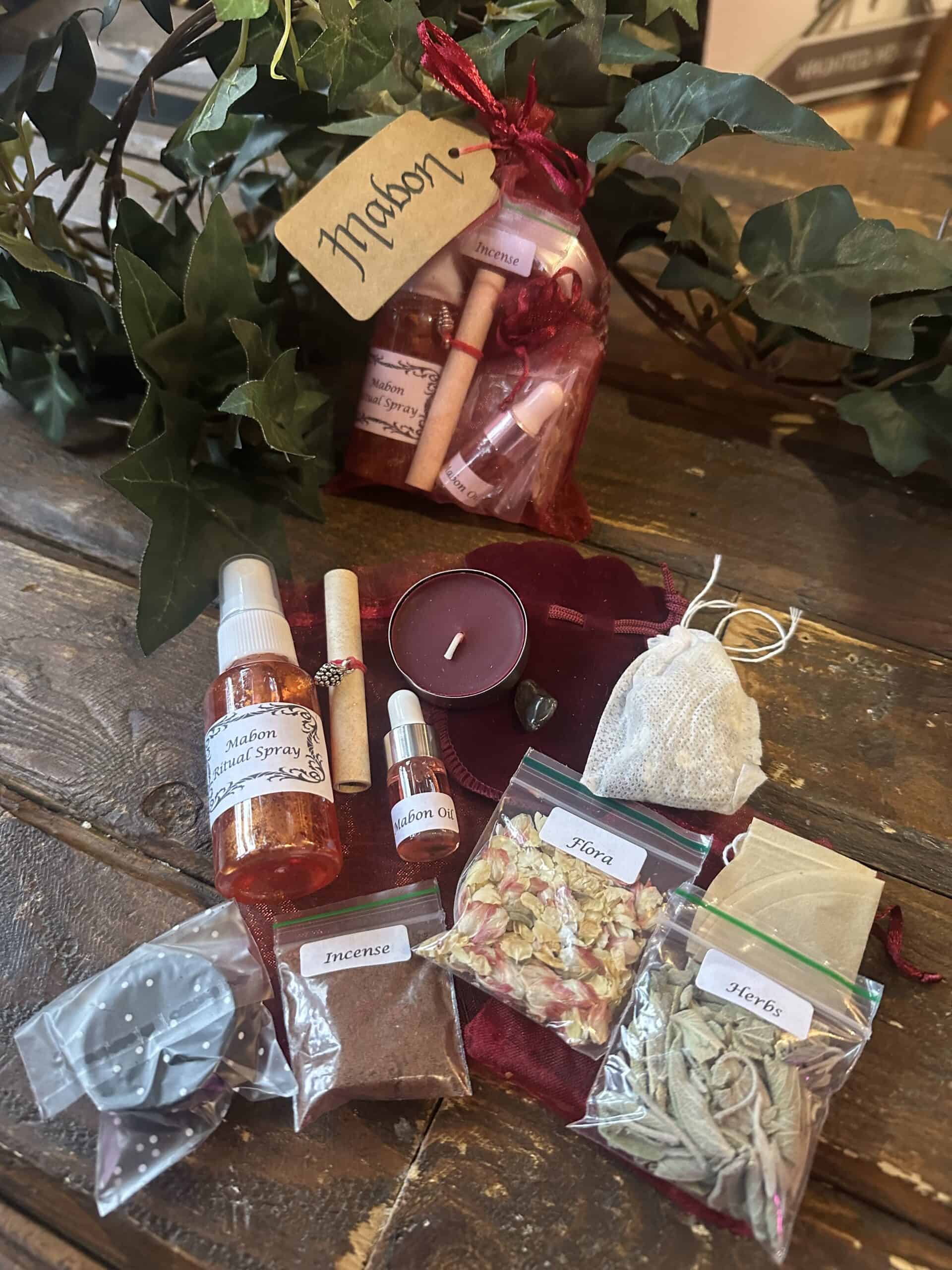 Lammas ritual water, charcoal disc, Lammas oil, offering bag of seeds, forging bags, sacred oil, DIY mojo bag kit (Hessian mojo bag, Lammas flora, herbs and tigers eye chips) instruction scroll with wheat charm.