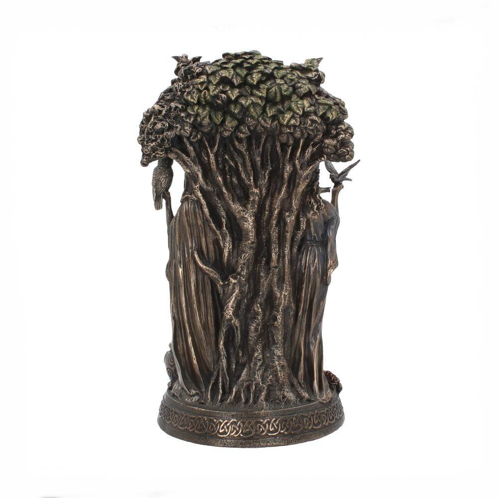 This beautiful statue is made of cold cast resin. This Celtic mythology figurine is cast in the finest resin before being given a bronze finish and painstakingly hand-painted. Three women stand with their backs to a large tree, side-by-side. At the left of the scene, the young woman wears flowing blue robes and holds her hands out as a small bird lands. Above her, the tree is blooming, and there is a waxing crescent moon, symbolising youth and growth. At her feet, roses are in flower. The middle woman is a little older and wears flowing red robes, her hands cupping her pregnant stomach. At her feet a sheaf of wheat has been laid, and above her the tree blooms with apples. The moon above her is full and emblazoned with a pentacle, symbolising fertility and the creation of new life. At the left, this older woman wears purple robes and holds an owl. The tree is withered and has a waning crescent moon, while at her feet is a cauldron with a pattern of triskelions, symbolising her wisdom and mastery of magic. Illustrating the cycle and stages of life, this beautiful statuette is the perfect centrepiece to any altar. |