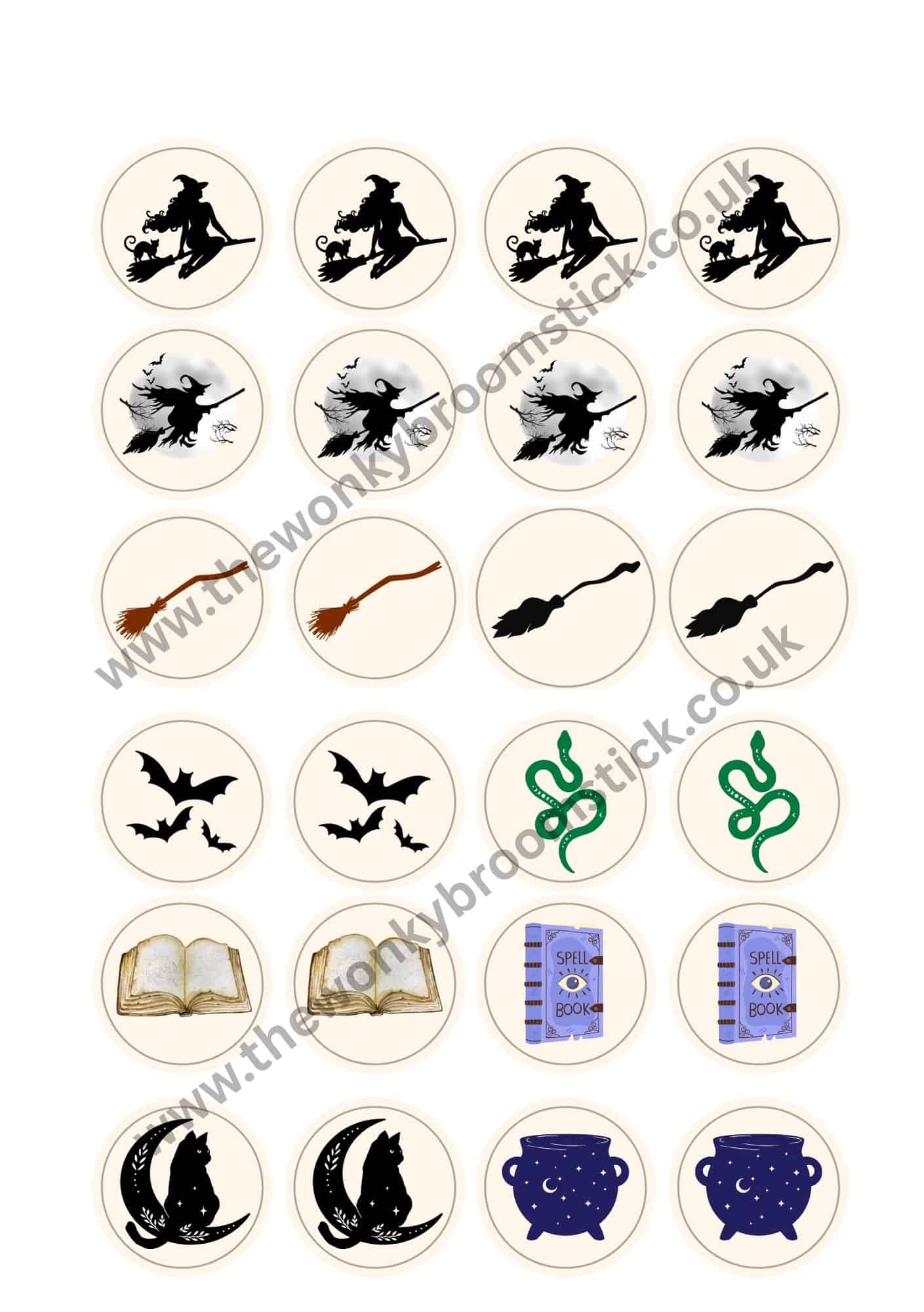 This sheet consists of 24 wonky designed Witchy circular stickers.
