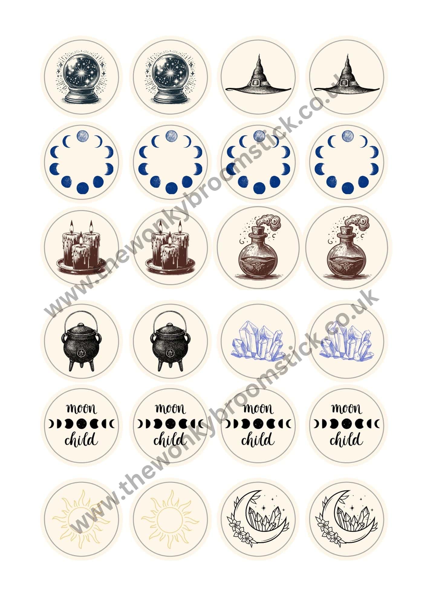 This sheet consists of 24 wonky designed Witchy circular stickers.