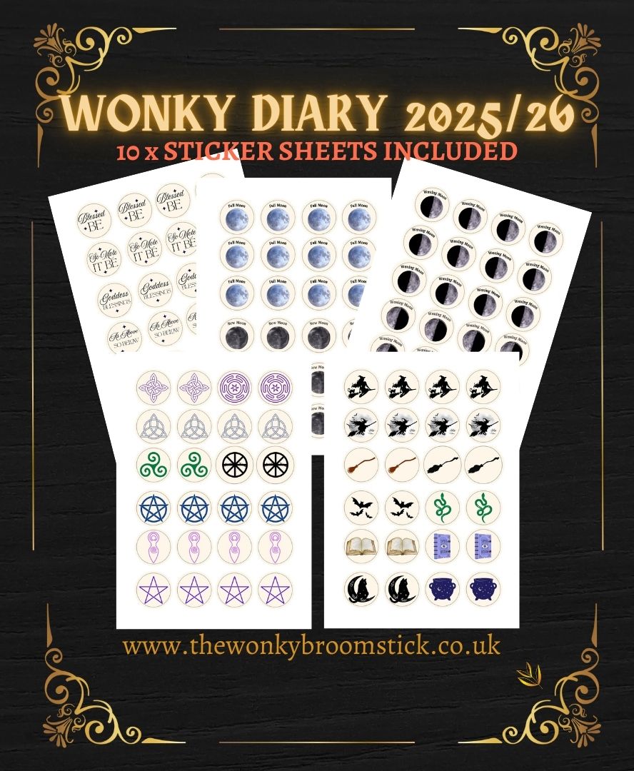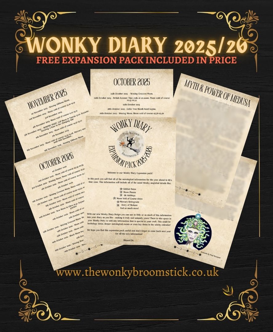Included FREE with your diary is our 26 A5 page Wonky expansion pack including all your astrological dates inc the full 8 moon phases with times and keynotes for the full and new moons, so you know what spells and rituals to do for you to fill into your diary, as well as Mercury retrograde dates for 2025/26, bank holidays and other prominent dates and holidays. You also have an article about the myth and legend of Medusa and then 10 x sticker sheets of 24 witchy and pagan wonky exclusive stickers so 240 stickers in total to decorate your diary with!